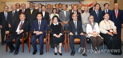 △ 2015 동아시아평화국제회의 (서울=연합뉴스) 한종찬 기자 = 13일 오전 서울 대한상공회의소에서 열린 '2015 동아시아평화국제회의'에서 참석자들이 기념촬영을 하고 있다. 앞줄 왼쪽 두번째부터 하토야마 유키오 전 일본 총리, 이희호 김대중평화센터 이사장, 동아시아평화 국제회의 대표인 이홍구 전 총리. 2015.8.13 saba@yna.co.kr