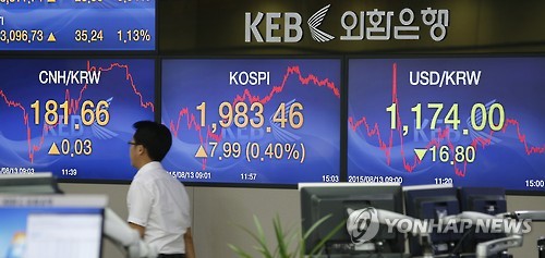 △ '위안화 충격' 완화 (서울=연합뉴스) 황광모 기자 = 중국의 위안화 평가절하가 사흘째 이어진 13일 오후 서울 명동 외환은행 딜링룸 전광판. 이날 코스피는 13일 사흘 연속 이어진 위안화 평가절하 충격을 딛고 반등에 성공해 7.99포인트(0.40%) 오른 1,983.46으로 마감했다.