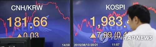 | △ '위안화 충격' 완화…코스피, 1,980선 회복 (서울=연합뉴스) 황광모 기자 = 중국의 위안화 평가절하가 사흘째 이어진 13일 오후 서울 명동 외환은행 딜링룸 전광판에 이날 원·위안화 환율과 코스피 지수가 표시 돼 있다. |