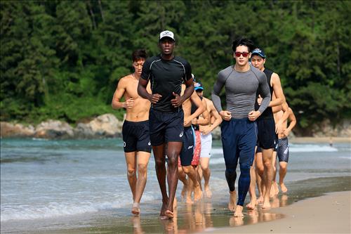 △ (서울=연합뉴스) 오레올(왼쪽), 문성민 등 현대캐피탈 선수들이 13일 남해 송정솔바람해변에서 체력 훈련을 하고 있다. <<현대캐피탈 제공>>