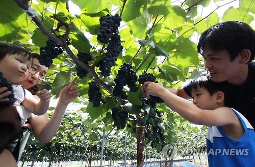 △ 옥천포도 수확 체험하는 관광객들 <<연합뉴스 DB>>