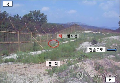 | △ 비무장지대 지뢰폭발 현장 (서울=연합뉴스) 지난 4일 비무장지대(DMZ)에서 우리 군 수색대원 2명에게 중상을 입힌 지뢰폭발사고는 군사분계선(MDL)을 몰래 넘어온 북한군이 파묻은 목함지뢰가 터진 것으로 조사됐다. 합동참모본부가 이날 공개한 사고발생 현장. 2015.8.10 << 합참 제공 >> photo@yna.co.kr |