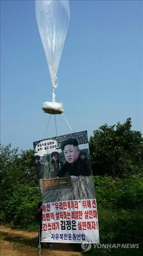 (파주=연합뉴스) 우영식 최재훈 기자 = 탈북자단체인 자유북한운동연합이 14일 경기도 접경지역에서 북한의 비무장지대(DMZ) 지뢰 도발 사건을 규탄하는 대북전단을 살포했다.