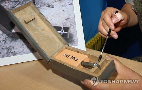 △ 북한이 DMZ에 매설한 목함지뢰 (서울=연합뉴스) 임헌정 기자 = 10일 서울 용산 국방부에서 군 관계자가 북한이 비무장지대(DMZ)에 매설한 살상용 목함지뢰에 대해 설명하고 있다. 군 당국은 성명을 통해 강력한 보복응징 의지를 천명하면서 북한에 대해 사과와 책임자 처벌을 촉구했다. 2015.8.10 kane@yna.co.kr
