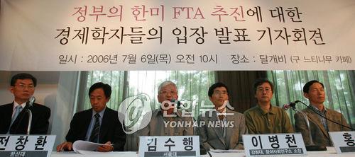 △ 2006년 정부의 한미FTA 추진에 대한 입장을 발표하는 고 김수행 교수