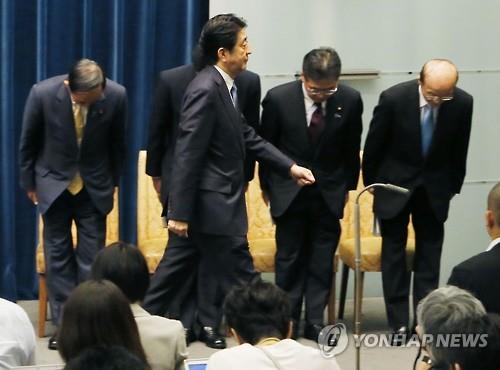 | △ (도쿄 교도=연합뉴스) 아베 신조(安倍晋三) 일본 총리가 14일 오후 도쿄 총리관저에서 일본의 전후 70년에 관한 담화(일명 아베 담화)를 발표하는 기자회견을 마치고 퇴장하고 있다. 배석했던 총리관저 관계자가 아베 총리가 회견장을 떠날 때 고개를 숙여 인사하고 있다. |