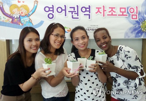 | △ "국적 달라도 마음은 통해요" (서울=연합뉴스) 고현실 기자 = 마포구 영어권 이주여성 자조모임 '원더풀' 회원들이 지난 7일 마포구다문화가족지원센터에서 직접 만든 화분을 들고 기념사진을 찍고 있다. 2015.8.17 okko@yna.co.kr |