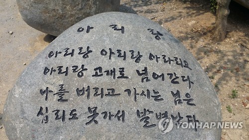 | △ 아리랑 비석 (문경=연합뉴스) 전국 각지의 아리랑 가사 1만68개를 전통한지에 옮기는 500일간의 작업이 완료됐다. 17일 문경새재 입구에 설치된 아리랑 비석. 2015.8.17 << 문경시 제공 >> |