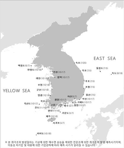 조석표에 따르면 인천·군산·부산·통영·제주를 포함한 서·남해안 지역은 10월 17∼18일, 목포·백령도 등은 6월 7∼8일, 여수·마산·서귀포 등은 5월 7∼8일이 각각 해수면이 가장 높은 시기가 될 전망이다.