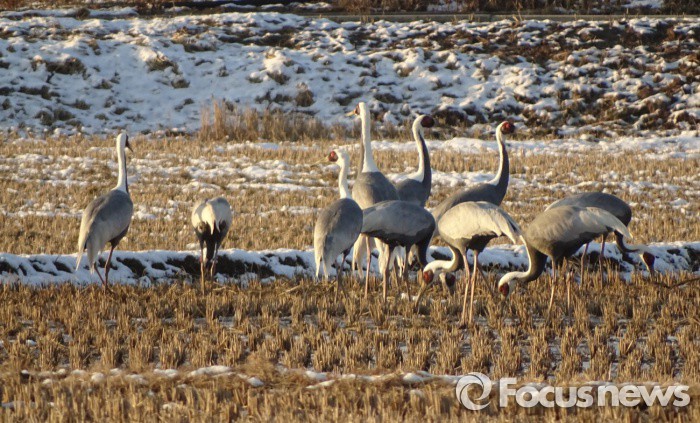(철원=포커스뉴스) 27일 최저 기온이 섭씨 영하 8도로 내려간 강원도 철원군 동송읍 들녘에서 재두루미(천연기념물 203호)무리가 낙곡을 찾고 있다. <사진제공=도연스님>포커스포토 photo@focus.kr