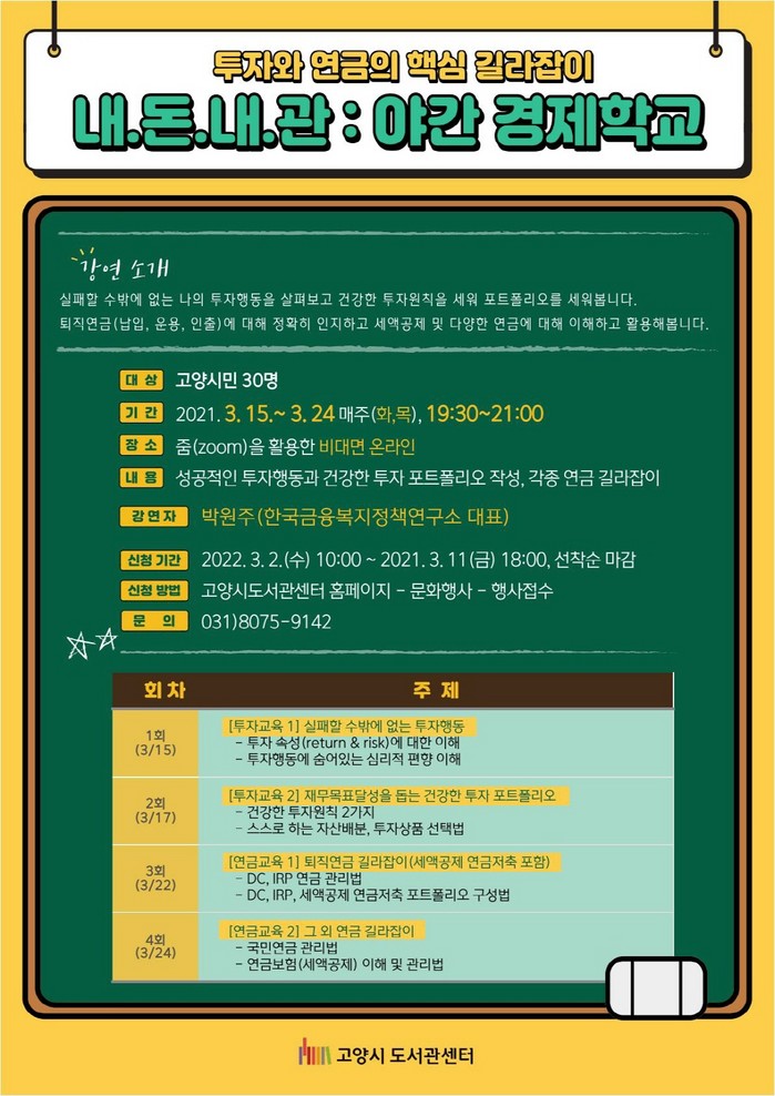 [부자동네타임즈 김인수기자] 고양시 풍동도서관은 오는 3월 15일(화)부터 3월 24일(목)까지 총 4회(매주 화, 목 19:30~21:00)에 걸쳐 성인을 대상으로 야간 경제학교를 진행한다.
