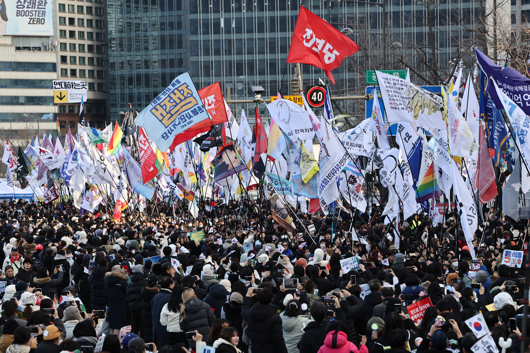 [부자동네타임즈 = 이의수 기자] 25일 오후 서울 광화문에서 윤석열 즉각 퇴진·사회 대개혁 비상행동 주최로 열린 에서 깃발행진 퍼레이드가 진행되고 있다. 2025.1.25