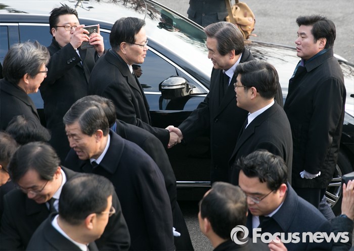 (서울=포커스뉴스) 병신년(丙申年) 새해 첫 날인 1일 오전 동작구 국립서울현충원에서 정의화 국회의장이 이승만 전 대통령 묘역 참배를 마친 뒤 참배를 위해 이동하는 김무성 새누리당 대표 등 의원들과 인사하고 있다.