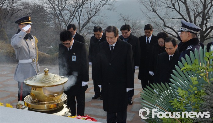 (서울=포커스뉴스) 병신년(丙申年) 새해 첫 날인 1일 오전 동작구 국립서울현충원에서 김무성 새누리당 대표가 김대중 전 대통령 묘역 참배를 하고 있다.