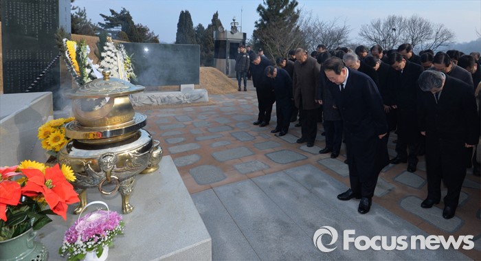(서울=포커스뉴스) 병신년(丙申年) 새해 첫 날인 1일 오전 동작구 국립서울현충원에서 통합신당을 추진 중인 박주선 무소속 의원이 김대중 전 대통령 묘역 참배를 하고 있다.