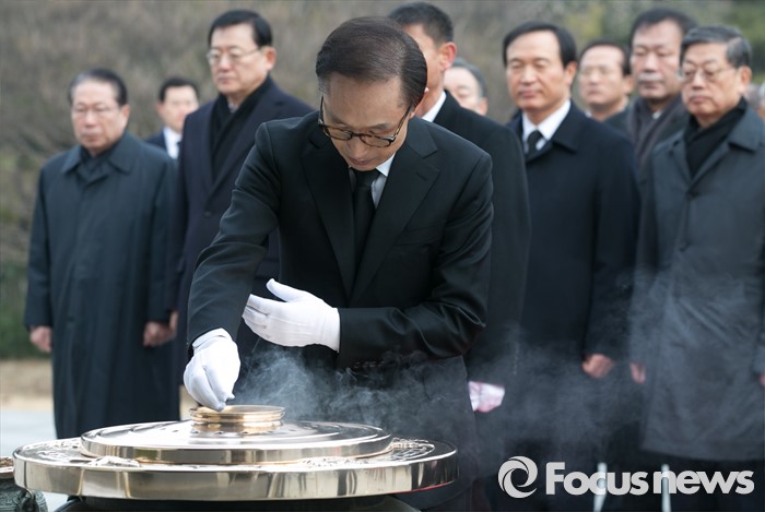 (서울=포커스뉴스) 병신년(丙申年) 새해 첫 날인 1일 오전 동작구 국립서울현충원에서 이명박 전 대통령이 현충탑 참배를 하고 있다.