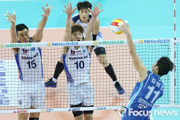 (인천=포커스뉴스) 3일 인천 계양체육관에서 열린 '2015-2016NH농협 V-리그' 남자부 대한항공-삼성화재 경기에서 삼성화재 김명진의 스파이크를 대한항공 김형우(15)와 정지석이 블로킹으로 막고 있다.