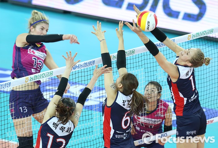 (인천=포커스뉴스) 3일 인천 계양체육관에서 열린 '2015-2016NH농협 V-리그' 여자부 흥국생명-KGC인삼공사 경기에서 흥국생명 테일러가 KGC인삼공사 한수지, 장영은, 헤일리의 3중 블로킹을 뚫는 스파이크를 날리고 있다.