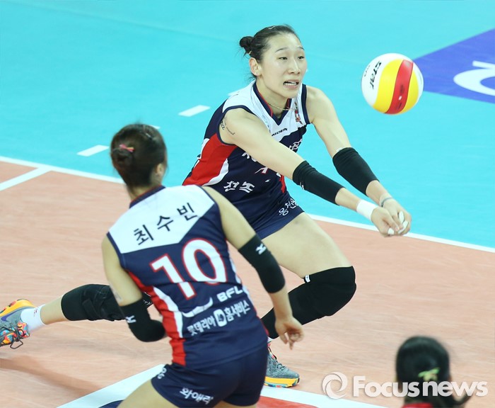 (인천=포커스뉴스) 3일 인천 계양체육관에서 열린 '2015-2016NH농협 V-리그' 여자부 흥국생명-KGC인삼공사 경기에서 KGC인삼공사 한수지가 블로킹에 맞고 떨어지는 공을 살리고 있다.