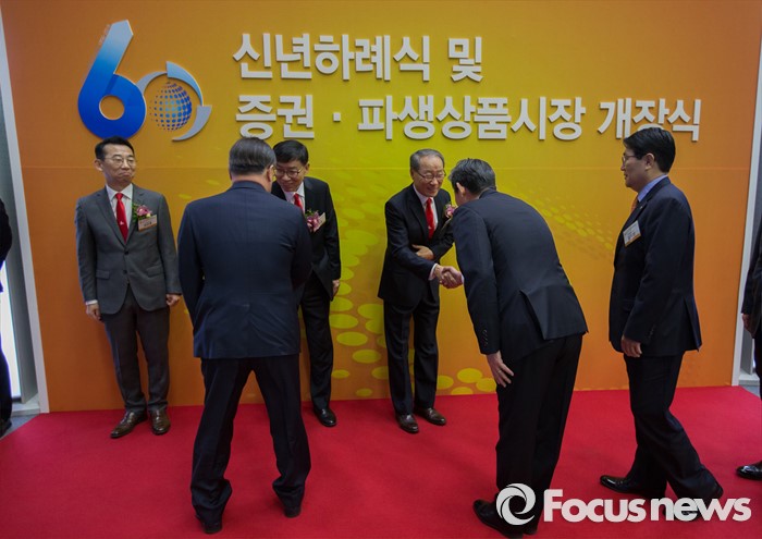 (서울=포커스뉴스) 병신년(丙申年) 새해 첫 증시 개장일인 4일 오전 영등포구 서울 여의도 거래소에서 2016년도 증권·파생상품시장 60주년 개장식 및 신년 하례식에서 임종룡 금융위원장이 참석자들과 인사를 나누고 있다