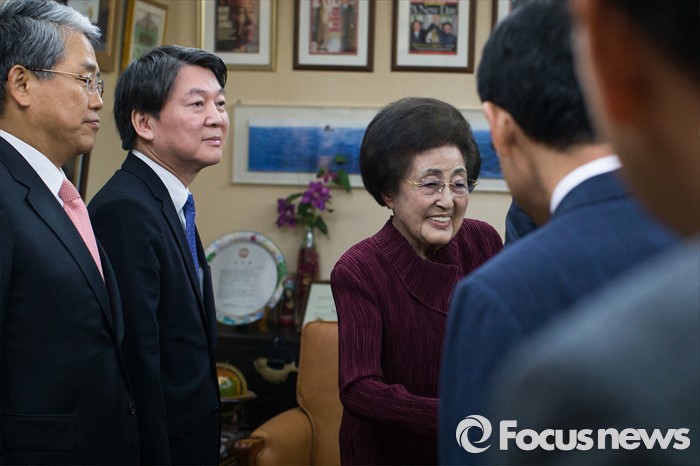 (서울=포커스뉴스) 고 김대중 전 대통령의 부인인 이희호 여사가 4일 서울 동교동 자택을 방문한 안철수 무소속 의원을 비롯한 신당 추진 의원들과 인사를 나누고 있다.