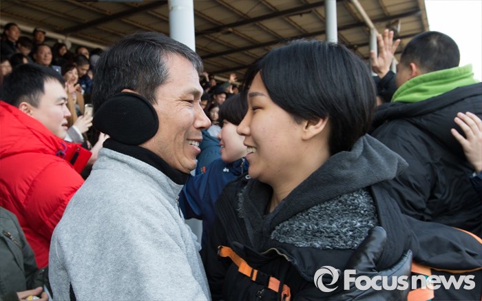(논산=포커스뉴스) 4일 오후 충남 논산 육군훈련소 입영심사대에서 입소를 앞둔 여군 부사관 후보생이 아버지와 포옹을 하고 있다.