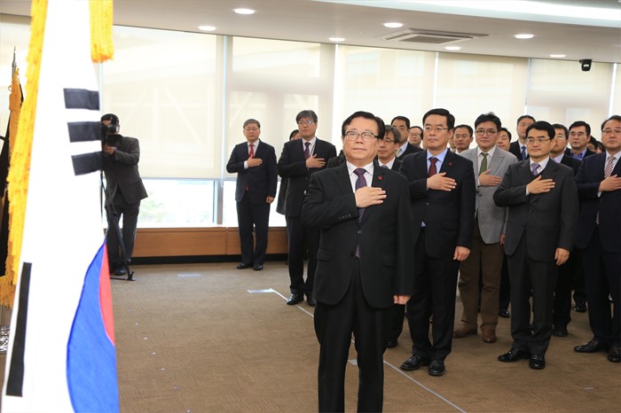 (세종=포커스뉴스) 이동필 농림축산식품부장관이 4일 세종시 정부세종청사 농식품부 대회의실에서 열린 시무식에 참석해 국기에 대한 경례를 하고 있다.