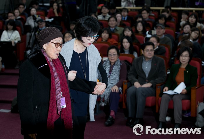 (서울=포커스뉴스) 5일 오후 서울 여의도 국회 의원회관에서 민주사회를 위한 변호사모임, 한국정신대문제대책협의회 등 주최로 열린 긴급진단, 2015년 한일 외교 장관 회담의 문제점 토론회에 참석한 위안부 피해자 김복동 할머니가 회담을 인정할 수 없는 이유와 관련 발언하기 위해 부축을 받으며 이동하고 있다.