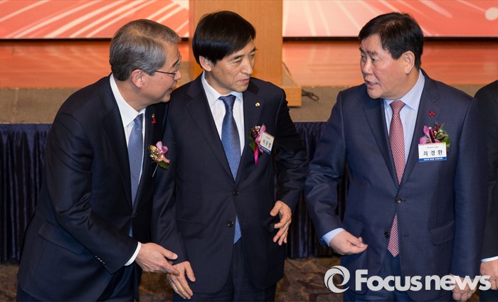 (서울=포커스뉴스) 5일 오후 서울 중구 롯데호텔에서 열린 '2016년 범금융 신년인사회'에서 임종룡(왼쪽부터) 금융위원장, 이주열 한국은행 총재, 최경환 경제부총리 겸 기획재정부 장관이 대화를 나누고 있다.