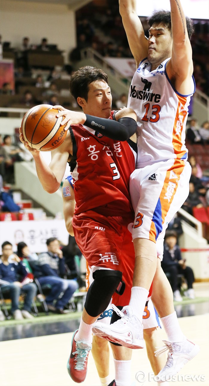 (안양=포커스뉴스) 5일 안양실내체육관에서 열린 2015-2016 프로농구 KGC-전자랜드 경기에서 KGC 이정현이 전자랜드 주태수의 마크를 받으며 패스를 시도하고 있다.