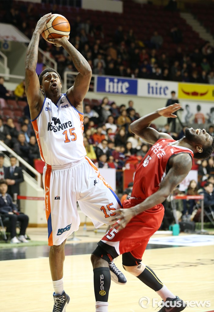 (안양=포커스뉴스) 5일 안양실내체육관에서 열린 2015-2016 프로농구 KGC-전자랜드 경기에서 전자랜드 포웰이 슈팅을 하는 도중에 KGC 마리오 리틀에게 파울을 범하고 있다.