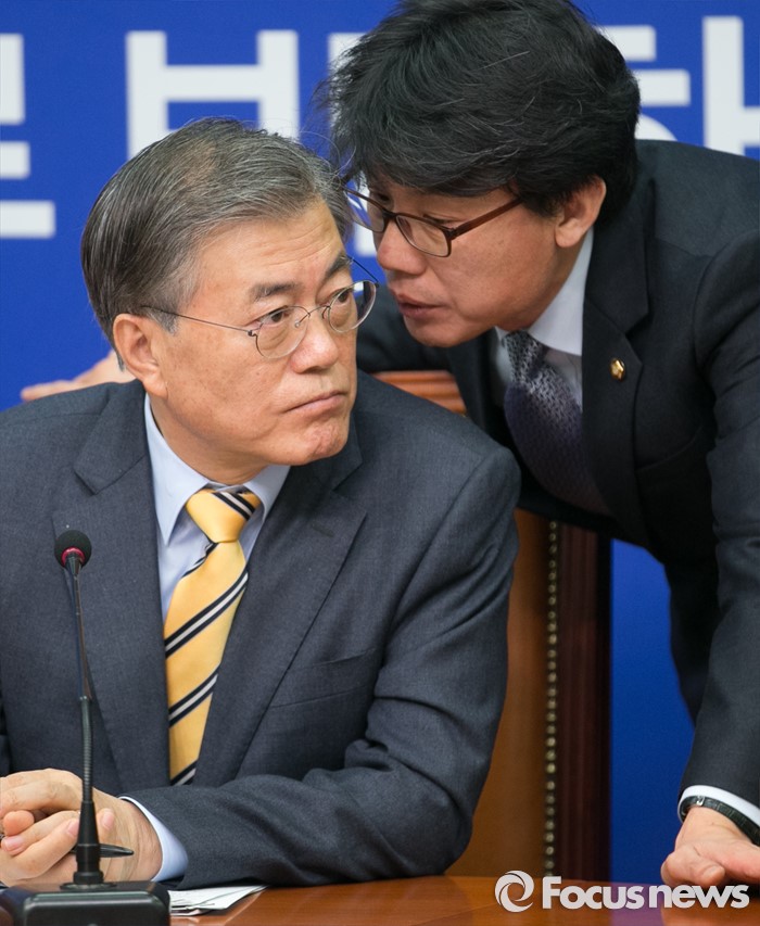 (서울=포커스뉴스) 문재인(왼쪽) 더불어민주당 대표와 진성준 전략기획위원장이 6일 오전 서울 여의도 국회에서 열린 최고위원회의에 참석해 대화하고 있다.