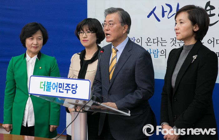 (서울=포커스뉴스) 문재인 더불어민주당 대표가 6일 오전 서울 여의도 국회에서 열린 김선현 세계미술치료학회장 입당식에 참석해 기자회견을 하고 있다. 왼쪽부터 추미애 최고위원, 김 학회장, 문 대표, 유은혜 대변인.