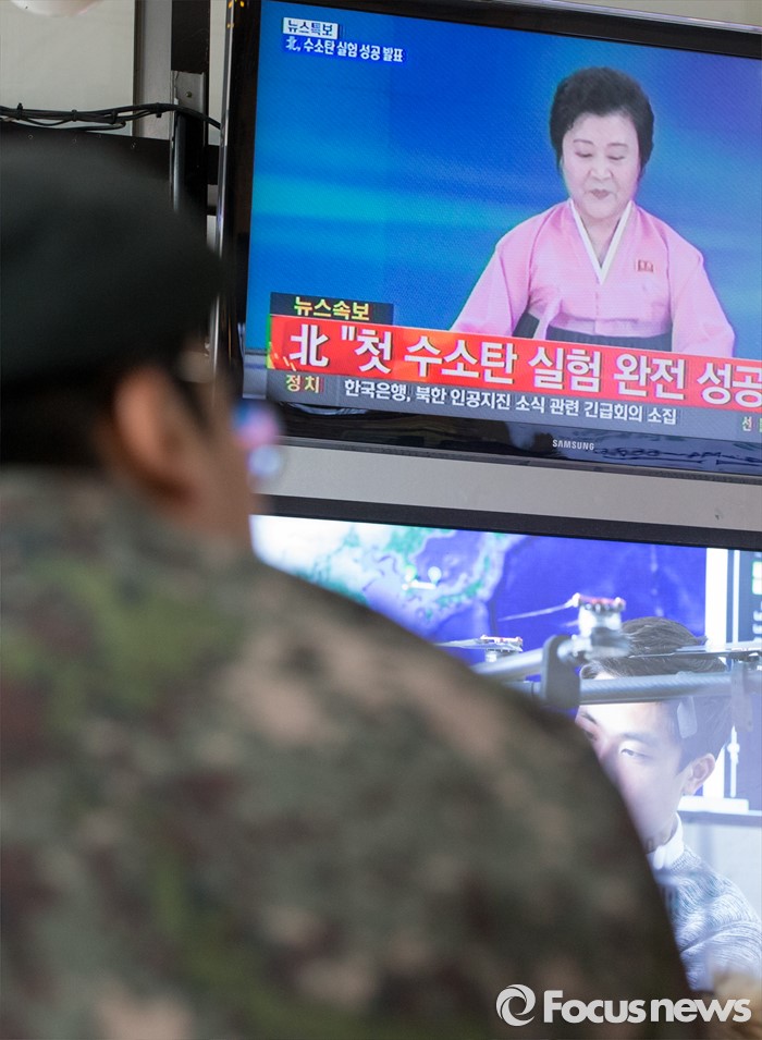 (서울=포커스뉴스) 북한이 첫 수소탄 핵실험을 실시했다고 발표한 6일 오후 서울 서초구 고속버스터미널에서 한 군인이 이에 관련된 뉴스특보를 시청하고 있다.