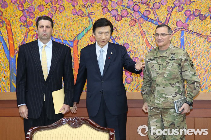(서울=포커스뉴스) 북한이 첫 수소탄 핵실험을 실시했다고 발표한 6일 오후 서울 종로구 외교부청사에서 마크 리퍼트(왼쪽부터) 주한 미대사와 윤병세 외교부 장관, 커티스 스캐퍼로티 한미연합사령관이 기념촬영하고 있다.