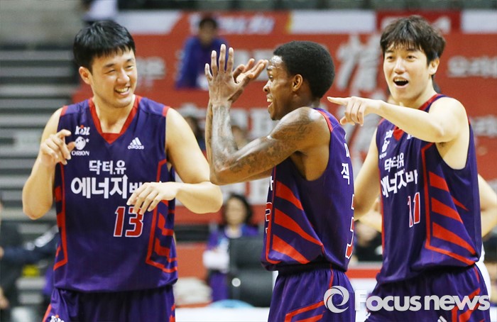 (고양=포커스뉴스) 6일 고양체육관에서 열린 2015-2016 프로농구 오리온-SK 경기에서 SK에 5점차 승리를 거둔 오리온 김동욱(13)과 허일영이 조 잭슨과 함께 기뻐하고 있다.