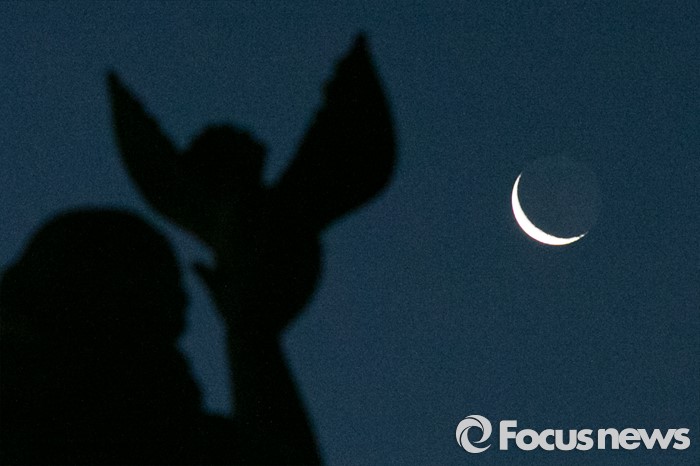 (서울=포커스뉴스) 7일 오전 서울 여의도 국회 평화와 번영의 상 하늘 위로 그믐달이 밝게 빛나고 있다.