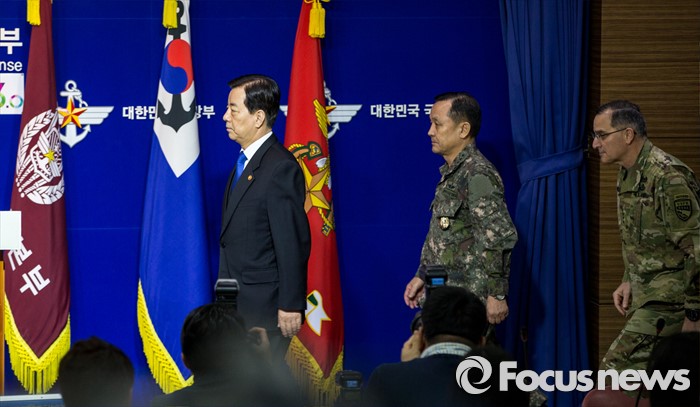 (서울=포커스뉴스) 한민구(오른쪽 세 번째) 국방부 장관을 비롯한 이순진(가운데) 합참의장, 커티스 스캐퍼로티 주한미군사령관이 7일 오전 서울 용산구 국방부에서 북한 수소탄 실험에 대한 한미 양국 공조 방안을 발표하기 위해 브리핑룸으로 들어서고 있다.