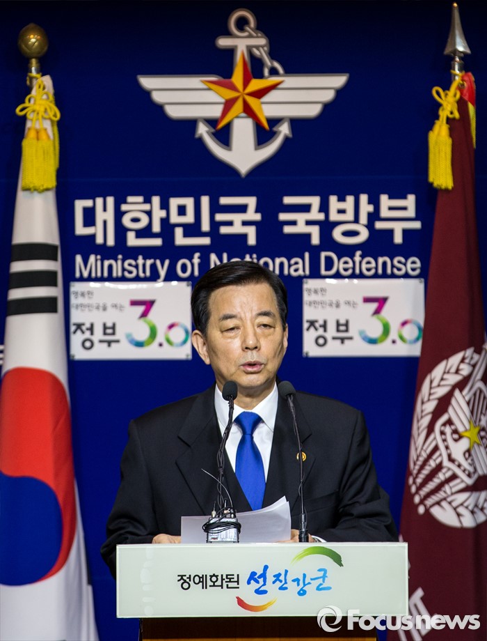 (서울=포커스뉴스) 한민구 국방부 장관이 7일 오전 서울 용산구 국방부에서 북한 수소탄 실험에 대한 한미 양국 공조 방안을 발표하고 있다.
