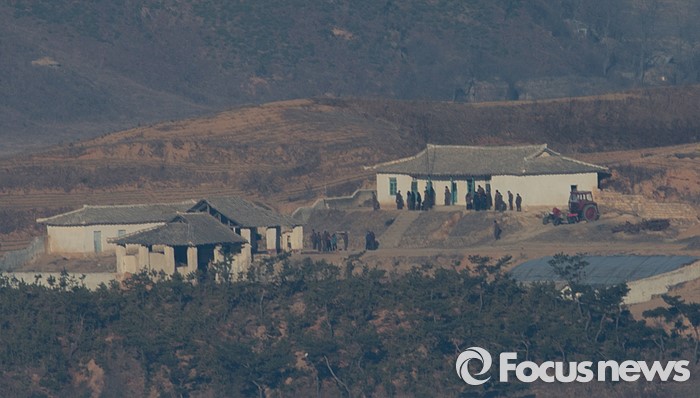 (파주=포커스뉴스) 7일 오전 경기도 파주 오두산 통일전망대에서 북한 황해북도 개풍군 탈곡장에 주민들이 관측되고 있다.
