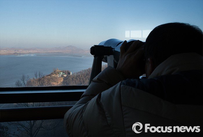 (파주=포커스뉴스) 7일 오전 경기도 파주 오두산 통일전망대에서 관광객이 망원경을 통해 황해북도 개풍군 일대를 관측하고 있다.