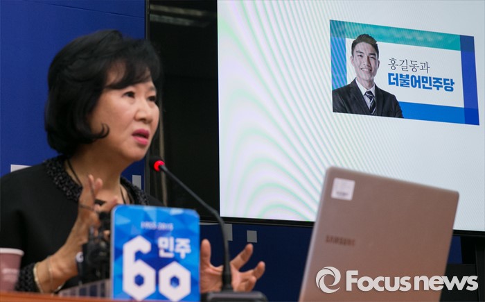 (서울=포커스뉴스) 손혜원 더불어민주당 홍보위원장이 7일 오전 서울 여의도 국회에서 당 로고 공개 기자간담회를 하고 있다.