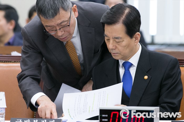 한 장관은 "북한 핵에 대해서는 맞춤형 확정억제라는 개념으로 억제하고 대비한다"고 덧붙였다(서울=포커스뉴스) 한민구(오른쪽) 국방부 장관과 류제승 국방정책실장이 7일 오전 서울 여의도 국회에서 북한의 수소탄 핵실험과 관련해 열린 국방위원회 전체회의에 출석해 현안보고 전, 논의하고 있다. 2016.01.07 박철중 기자