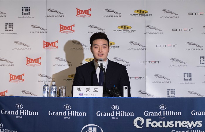 (서울=포커스뉴스) 미네소타 트윈스에 입단한 박병호가 7일 오전 서울 서대문구 그랜드힐튼호텔에서 기자회견을 열고 메이저리그 진출에 대한 소감과 포부를 밝히고 있다.