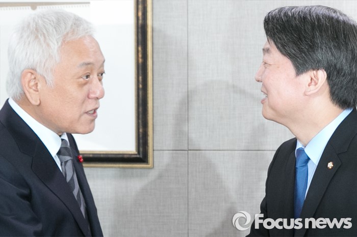 (서울=포커스뉴스) 더불어민주당을 탈당한 김한길(왼쪽), 안철수 의원이 7일 오후 서울 여의도 국회 의원회관 의원식당에서 오찬 회동을 위해 만나, 인사하고 있다.