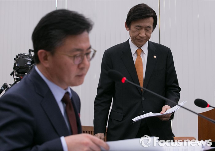 (서울=포커스뉴스) 7일 오후 서울 여의도 국회에서 북한의 수소탄 핵실험 발표 등에 관한 긴급 현안보고를 위해 열린 외교통일위원회 전체회의에 참석한 윤병세 외교부 장관이 현안보고를 마친 뒤 자리로 향하고 있다. 왼쪽은 홍용표 통일부 장관.