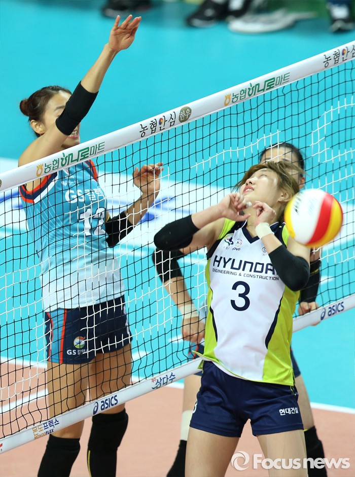 (서울=포커스뉴스) 7일 장충체육관에서 열린 '2015-2016NH농협 V-리그' 여자부 GS칼텍스-현대건설 경기에서 GS칼텍스 한송이가 현대건설의 리시브 실수로 넘어온 볼을 스파이크로 때리고 있다.