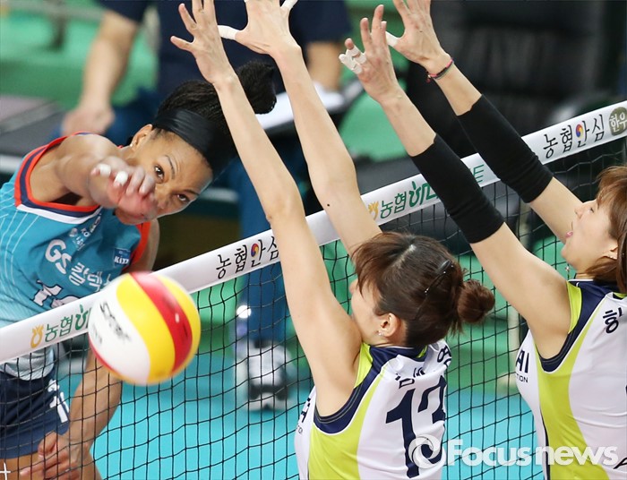 (서울=포커스뉴스) 7일 장충체육관에서 열린 '2015-2016NH농협 V-리그' 여자부 GS칼텍스-현대건설 경기에서 GS칼텍스 캣벨이 현대건설 김세영, 황연주의 블로킹을 피해 강스파이크를 때리고 있다.