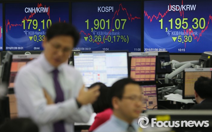 (서울=포커스뉴스) 남북 긴장고조와 중국발 악재 영향으로 코스피 지수 1889.42로 개장하고 1900선을 다시 회복한 8일 오전 서울 중구KEB하나은행 딜링룸에서 직원들이 업무에 열중하고 있다.