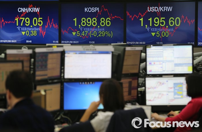 (서울=포커스뉴스) 남북 긴장고조와 중국발 악재 영향으로 코스피 지수 1900선이 무너진 8일 오전 서울 중구 KEB하나은행 딜링룸에서 직원들이 업무에 열중하고 있다.
